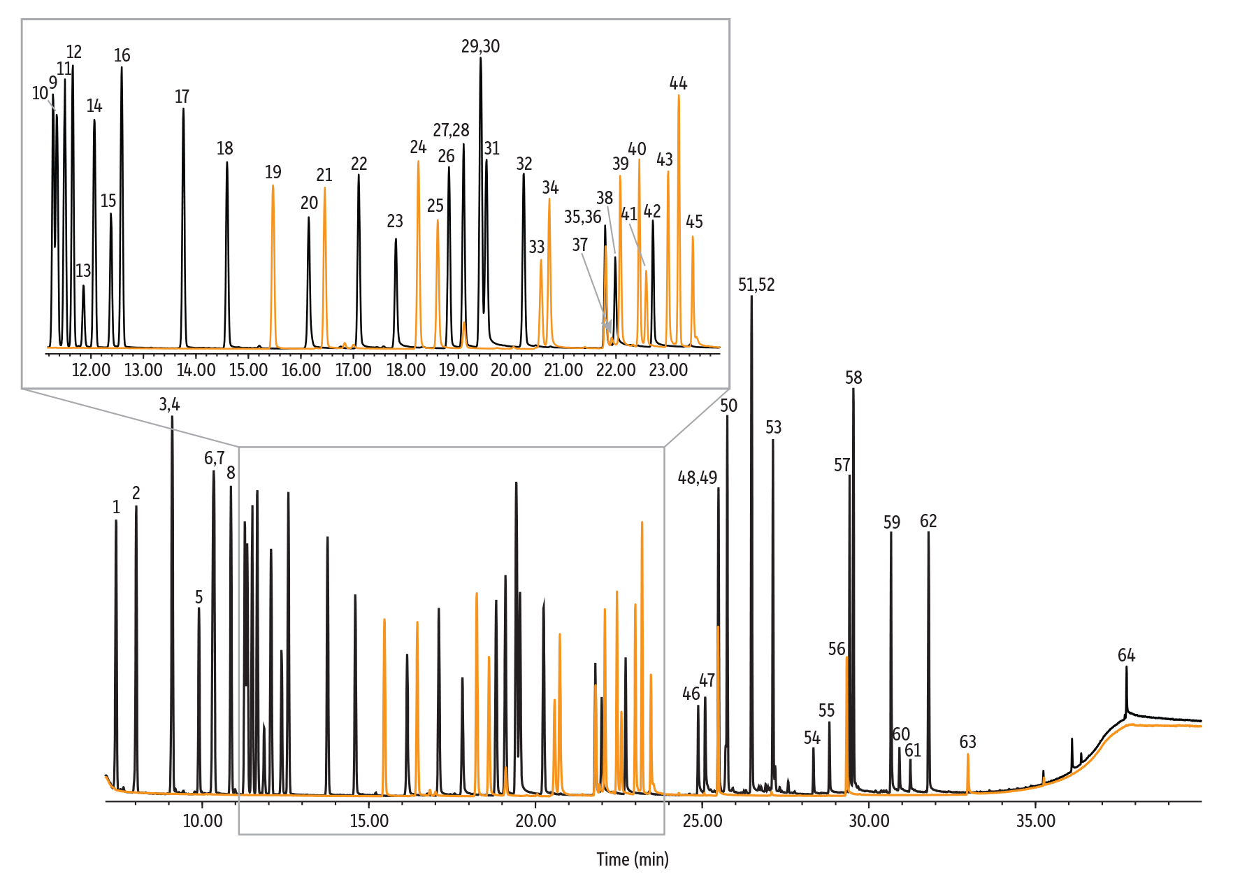 Since the development of this workflow, additional work was done to expand the number of terpenes that could be tested in cannabis and similar matrices. The current sample preparation workflow is anticipated to be suitable for the expanded terpenes list, but interested labs should verify this independently and note that the analytical methods use different GC columns and conditions. The expanded terpenes analysis uses an Rxi-1301Sil MS column (cat.# 16094) and terpene MegaMix #1 & 2 standards (cat.# 34142 & 34143). Chromatographic separation and conditions for the expanded list are shown in Figure 3.