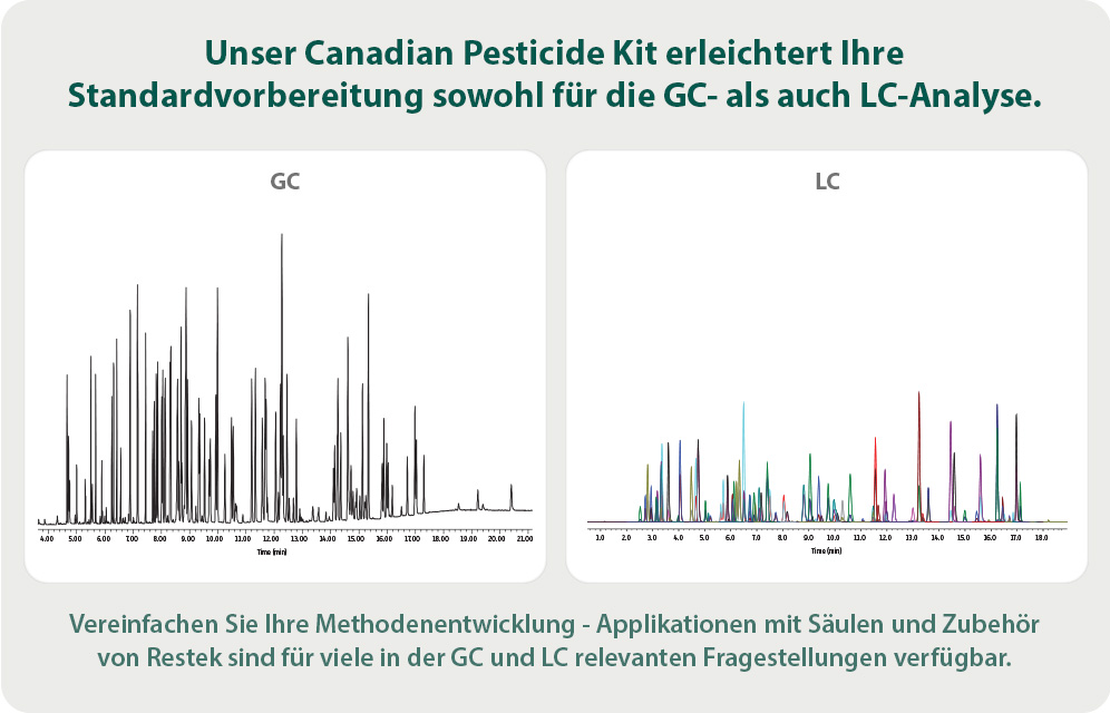 Das neue Canadian Pesticide Kit von Restek umfasst die 96 Pestizide, die durch die kanadische Gesetzgebung in Cannabis reguliert sind, und vereinfacht damit Ihre Standardvorbereitung – das spart Zeit und Kosten. Von jedem Standard werden in unserem ISO-akkreditierten Labor zwei unabhängige Chargen hergestellt, und die Verifizierung der Übereinstimmung von Charge zu Charge erlaubt, Qualitätsanforderungen mit Sicherheit zu erfüllen. Mit jedem Standard stellen wir ein deaktiviertes Vial für die Aufbewahrung zur Verfügung, um den Abbau von Komponenten an der Glasoberfläche zu minimieren.