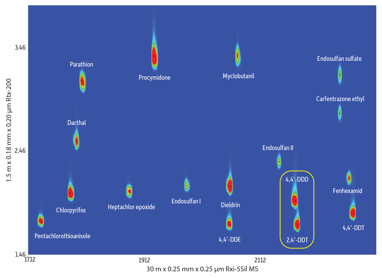 As shown by the extensive spread along the x and y axes, a GCxGC analysis with Rxi-5Sil and Rtx-200 columns easily separates and quantifies compounds with isobaric interferences, such as 2,4′-DDT and 4,4′-DDD (Figure 7).