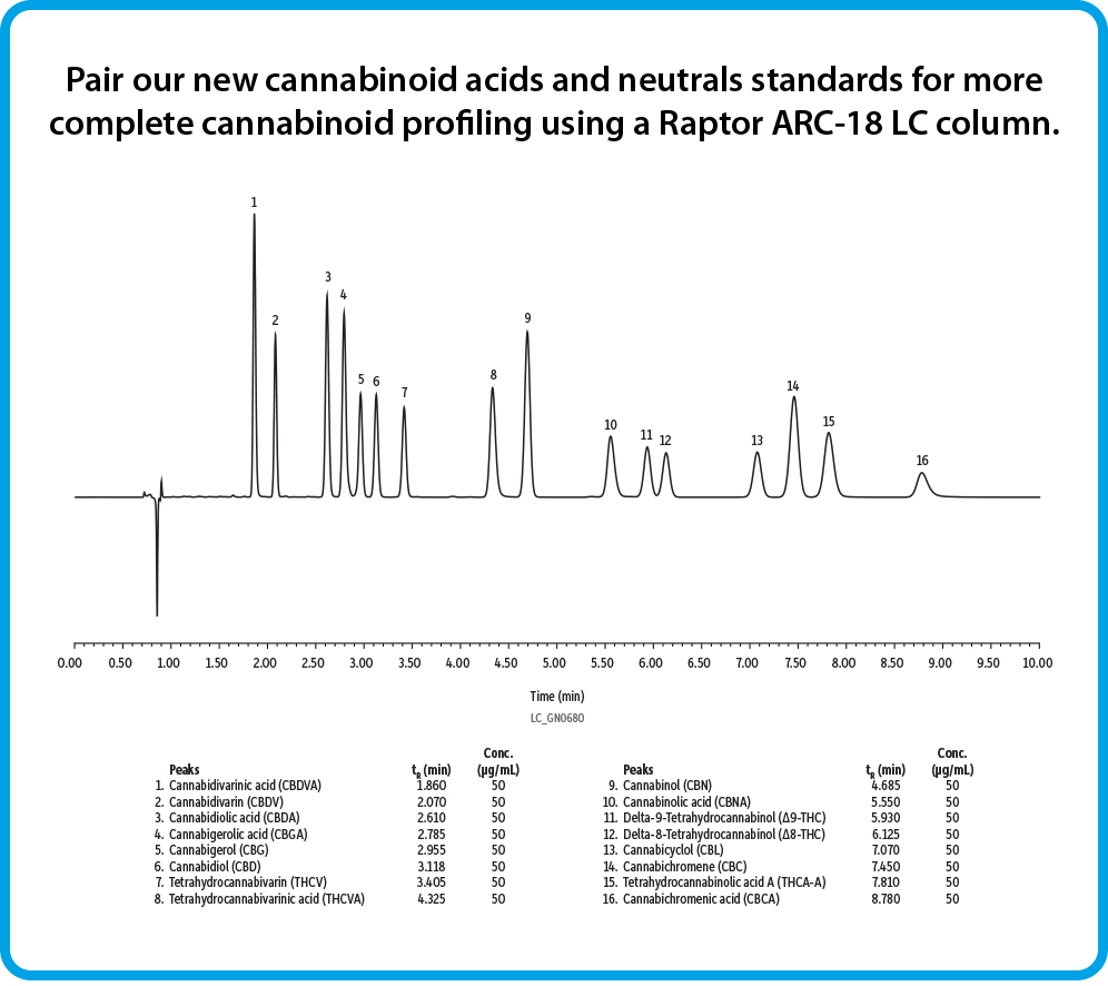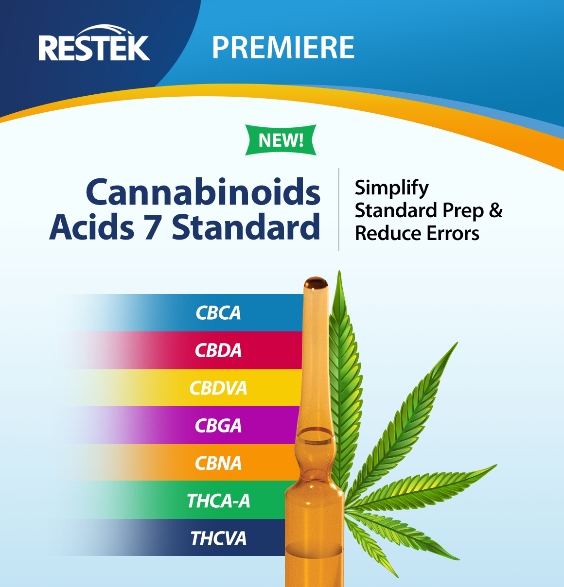 With more cannabinoid acids than other standards on the market, Restek’s newest certified reference material offers a simpler solution for cannabis and hemp potency testing. Containing seven of the most frequently analyzed cannabinoid acids, our cannabinoids acids 7 standard reduces the time, expense, and error associated with in-house preparation of mixed standards from single-compound solutions. The high-concentration (1000 µg/mL) formulation maximizes flexibility when developing appropriate working standards for the wide range of cannabinoids and sample types encountered in potency testing.